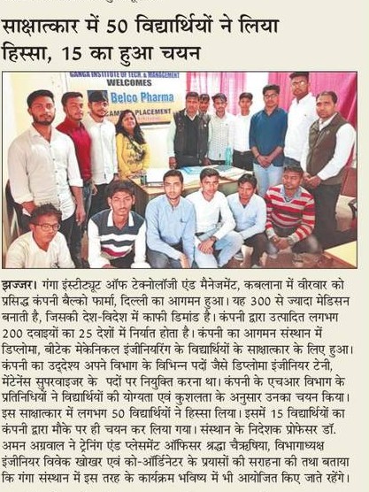 Campus Placement Drive by Belco Pharmacy,Bahadurgarh for B.Tech(CSE)/MBA students on 08/03/19