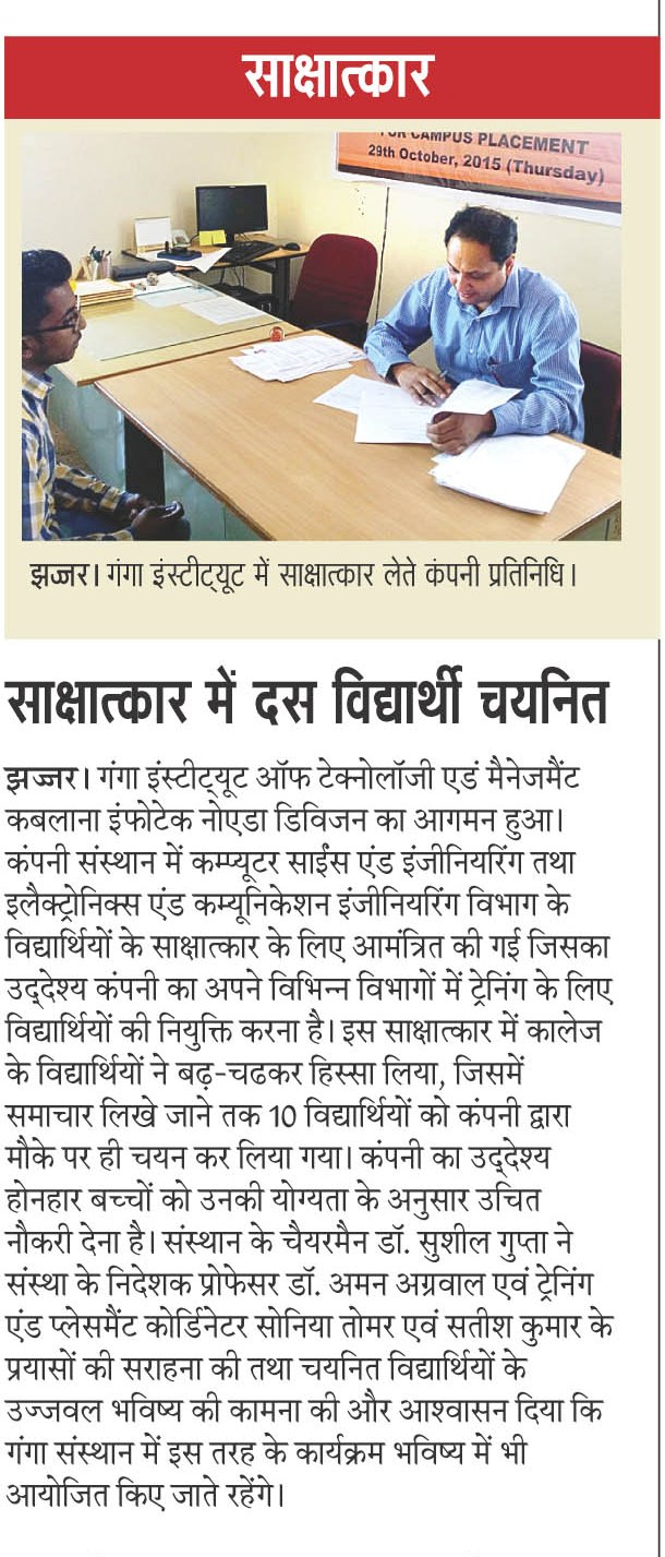 Campus Placement Drive for B.Tech( CSE & ECE) Students by CETPA Infotech Pvt. Ltd.,Noida on 23rd Jan, 2016.
