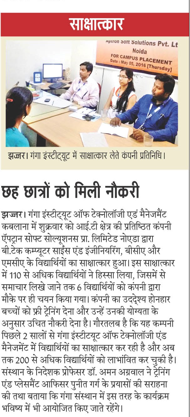 Campus Placement Drive for B.Tech(CSE)/BCA/MCA Students by Aptron Soft Solutions Technologies Pvt. Ltd., Rohtak on 05 May, 2016.